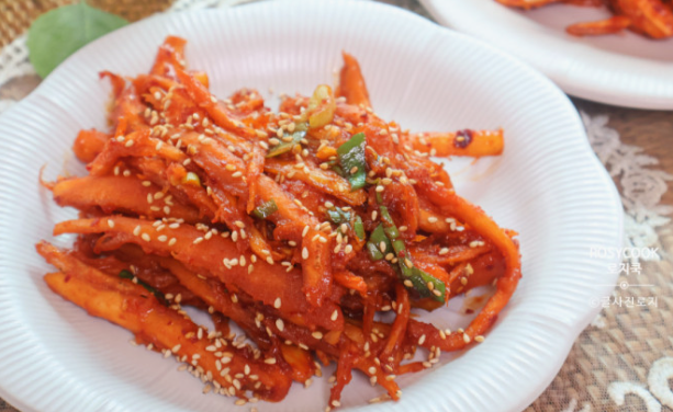 - 방법: 더덕을 씻어 껍질을 벗긴 후 길게 찢어 물에 담가 쓴맛을 제거합니다. 고추장, 고춧가루, 설탕, 식초, 다진 마늘, 참기름, 깨소금을 섞어 만든 양념장에 더덕을 버무려 10분 정도 두어 양념이 스며들게 합니다.